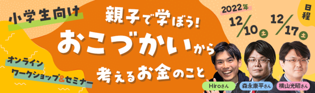 本セミナーは、「おこづかい」をテーマに1時間半の開催を予定しており、前後半にわけて親子参加型ワークショップと親向けセミナーを行います。前半は、株式会社イノビオットが運営する子ども向けオンラインスクール「みらいいアカデミア」代表講師のHiro氏(12月10日)および株式会社マネネ代表取締役社長の森永 康平氏(12月17日)による親子で参加できるワークショップを実施します。それぞれ「おこづかい」に関するゲームやクイズを行い、日常的に家族でお金について会話ができるようなきっかけやアイディアをお届けします。後半は両日共、6人のお子様を持ち、ご自身も「マネー家族会議」をご家庭で実施している、家計再生コンサルタント・ファイナンシャルプランナーで、株式会社マイエフピー代表の横山 光昭氏に、「おこづかい」のあげ方や見守り方、そこから見える家計の見直し術など、大人の方向けのセミナーを実施いただきます。