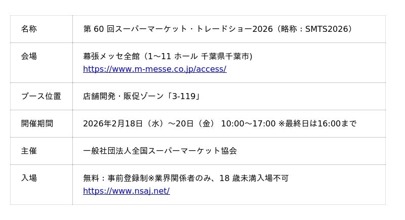 2026年2月18日(水)~20日(金)に幕張メッセで開催される「スーパーマーケット・トレードショー2026」に、昨年に続き2年連続でブースを出展いたします。