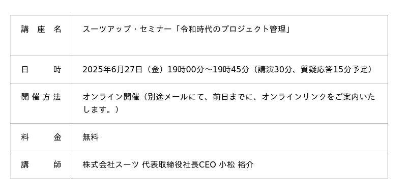 スーツアップ 無料お試しはコチラ1.スーツアップ・セミナー「令和時代のプロジェクト管理」概要当社では、2025年6月27日(金)19時から、当社代表の小松が講師を務めるスーツアップ・セミナー「令和時代のプロジェクト管理」を無料開催します。