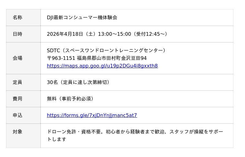 株式会社スペースワン福島ドローンスクール(運営:株式会社スペースワン、代表取締役:小林康宏)は、2026年4月18日(土)にDJI最新機体の無料体験会を開催。初心者・経験者問わず空撮や飛行を楽しみたい方を歓迎します。