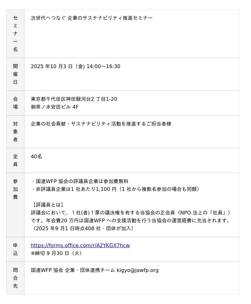 認定NPO法人国際連合世界食糧計画WFP協会(以下、国連WFP協会、神奈川県横浜市:安藤宏基会長)は、10月3日(金)に企業のサステナビリティ担当者を対象にしたセミナーと企業交流会を開催します。企業の方からの多くのご参加をお待ちしています。