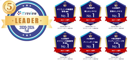 また、MAツール部門のすべての部門において、オフライン行動履歴管理でNo.1を獲得したほか、大企業部門では4項目でNo.1を獲得(導入のしやすさ、管理のしやすさ、オフライン行動履歴管理、ダッシュボード)、中堅企業部門では1項目でNo.1を獲得(ランティングページ作成)しています。