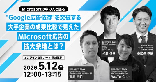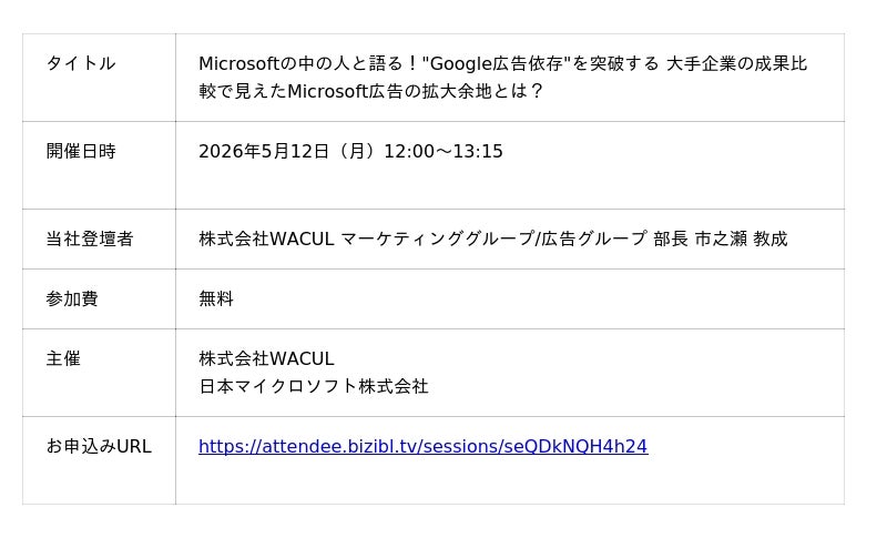 株式会社WACUL2026年5月12日に「Microsoftの中の人と語る!"Google広告依存"を突破する 大手企業の成果比較で見えたMicrosoft広告の拡大余地とは?」を株式会社WACULが開催いたします。