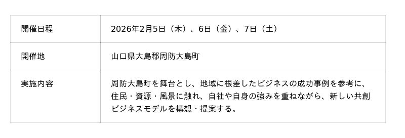 株式会社みらいワークス(本社:東京都港区、代表取締役社長 岡本 祥治、以下「当社」)は、山口県(知事 村岡 嗣政)とANAあきんど株式会社(本社:東京都中央区、代表取締役社長 原 雄三、以下「ANAあきんど」)と連携し、山口型ワーケーション(*1)の企業向けリスキリング企画を推進していることをお知らせいたします。都市部企業を対象とした山口県内での地域課題解決型研修プログラムを企画・提供し、企業の実践型リスキリングと山口県の関係人口創出を推進します。