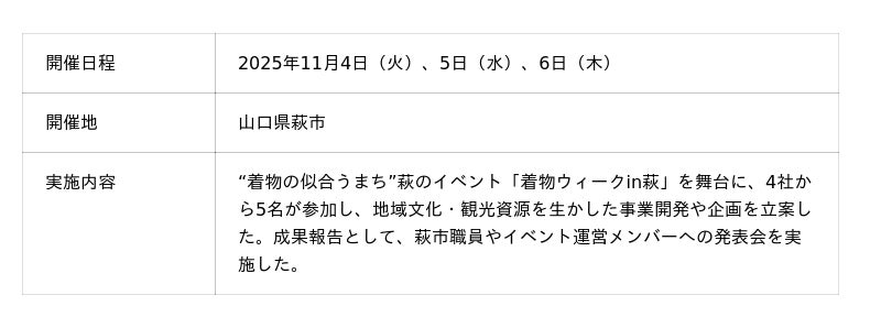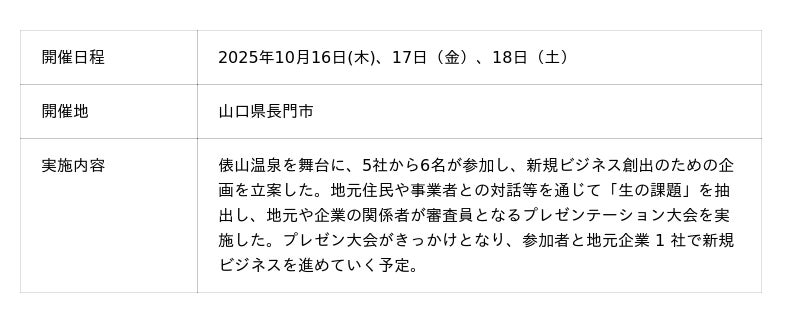 当社は2025年度より、山口県とANAあきんどと連携し、当社が培ってきた都市部企業向け実践型リスキリングやワーケーションのノウハウを最大限に活用し、山口県の地域課題をテーマとした企業向けのリスキリング研修を企画・実施しております。これにより、参加者のウェルビーイング向上や、意識変容・行動変容を促進し、企業の実践型リスキリングの推進と山口県の関係人口の創出に貢献してまいります。
