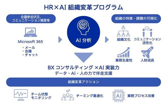 こうした背景を踏まえ、電通総研と電通は、業務基盤として多くの企業に導入されている Microsoft 365 に蓄積されるデータを活用し、組織の行動を可視化・分析することで、組織課題の特定から変革の実行までを支援する「HR×AIの組織変革プログラム」を開発しました。