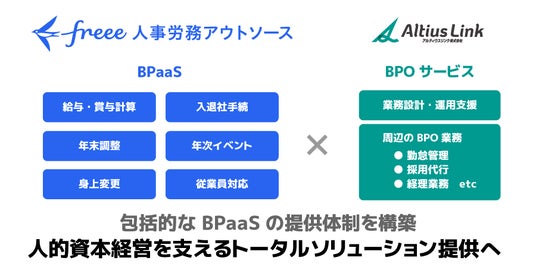 freeeが提供する「freee人事労務アウトソース」は、入退社手続き・身上情報の変更・給与計算・年末調整といった、人事労務業務のBPaaSです。本取り組みでは、「freee人事労務アウトソース」を基盤に、アルティウスリンクが勤怠管理・採用代行・経理など、幅広いバックオフィス業務に対応するBPOサービスを組み合わせ、BPaaSの効率性に加え、BPOの柔軟性を融合した業務支援体制を構築します。企業ごとのニーズに合わせた設計・運用により、人事労務領域の幅広いバックオフィス業務を一括でアウトソース可能になり、業務負荷の軽減やコスト削減、社員のエンゲージメント向上、コア業務への集中による企業価値の最大化など、企業の持続的成長の基盤となるバックオフィス体制を実現します。