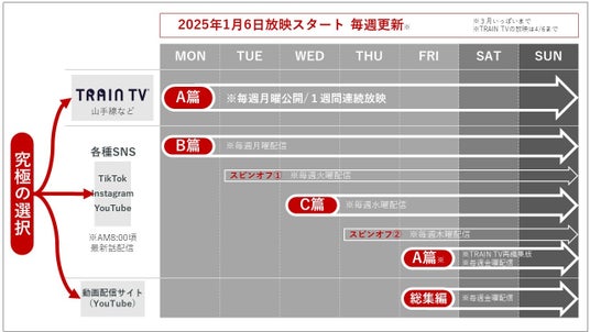 本コンテンツは、マルチエンディング形式による1話完結のショートドラマで、遠藤憲一さん、萩原利久さん、村重杏奈さん、星乃夢奈さん、中島結音さんが、日常生活に潜む「究極の選択」を迫られる役柄を演じます。毎週迫られるさまざまな「究極の選択」の行方を、昨年4月に開局しJR 東日本の⾸都圏主要 10 路線とゆりかもめの車両サイネージで展開する番組配信プラットフォーム「TRAIN TV(R)(トレインティーヴィー)」で放映、およびTikTok などの公式 SNS アカウントで配信し、1週間かけて順次公開します。