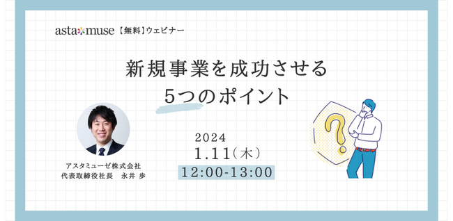 アスタミューゼ株式会社(本社:東京都千代田区、代表取締役社長 永井歩)は、2024年1月11日(木)12:00-13:00に、経営企画・事業戦略担当者、新規事業担当者向けの無料ウェビナー「新規事業を成功させる5つのポイント」開催します。2023年12月にも実施した同タイトルのウェビナーがご好評だったため、2024年1月にも再開催いたします。