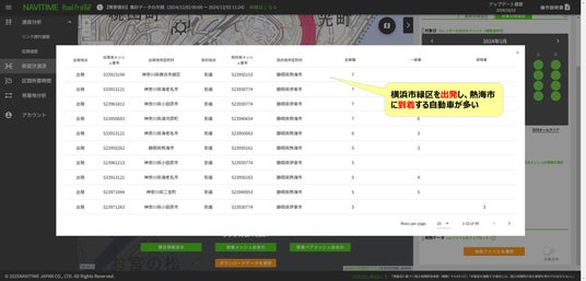 「OD分析」は、これまで出発地または到着地をメッシュ(10km・500m単位)単位での分析が可能でしたが、新機能では、特定の道路(リンク)を通過した自動車の出発地・到着地も分析可能となりました。市町村単位で出発地・到着地のペア、あるいはそのいずれかを表形式で表示できます。これにより、商圏や移動範囲など、道路の利用特性を狭域・広域で詳細に把握することが可能となります。