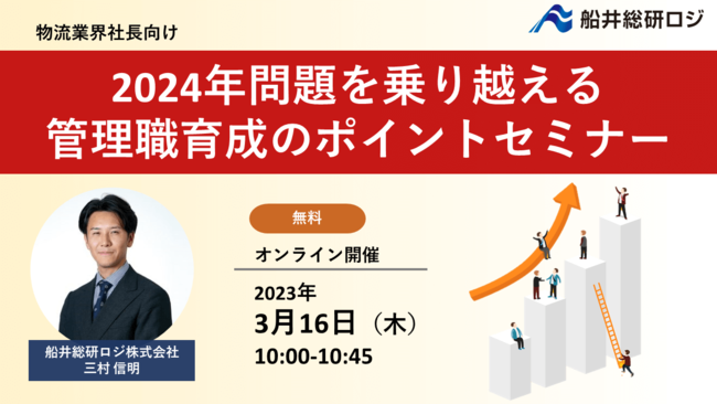 ロジスティクス・物流コンサルティングサービスを提供する船井総研ロジ株式会社(東京本社:東京都千代田区、代表:菅重宏、以下「船井総研ロジ」)は、2023年3月16日(木)10:00~10:45、物流企業の経営者を対象に「第4回 2024年問題を乗り越える管理職育成のポイントセミナー」をオンラインで開催いたします。