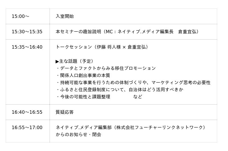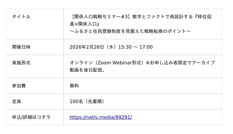 株式会社フューチャーリンクネットワーク(本社:千葉県船橋市、代表取締役:石井丈晴、以下 FLN)は、自治体・地域事業者などの関係者に向けたオンラインセミナー「【関係人口戦略セミナー#3】数字とファクトで再設計する『移住促進×関係人口』 ~ふるさと住民登録制度を見据えた戦略転換のポイント~」を、2026年2月26日(木)に開催します。