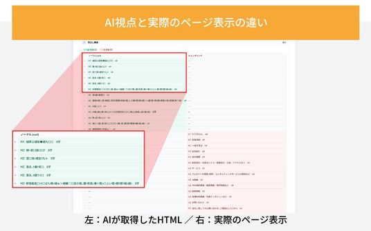 <新機能のポイント>本機能では、対象のWebページのURLを入力し、AIから見たページの内容(HTML情報)と、人間の目で見たときの表示の差異を確認することが可能です。