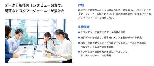 特長調査会社として年間6,600件以上のデータ分析に関わっており、その顧客理解のノウハウを基に、データ分析前の段階からクライアントに伴走します。アンケート調査やインタビュー調査などと掛け合わせたペルソナ理解もできるのが特長です。