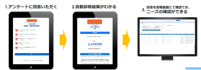 「活用診断OEM」とは、アンケートに回答するだけで、最適な助成金・補助金を自動診断するシステムです。