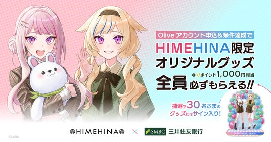 Oliveアカウントを新規開設(または切替)し、キャンペーンにエントリーした方全員に、「HIMEHINA限定オリジナルグッズ」「Vポイント(1,000円相当)」「描き下ろしイラスト使用のスマホ・PC壁紙」をプレゼントします。さらに、抽選で30名様にはHIMEHINAの複製サイン入り限定オリジナルグッズをお届けします。