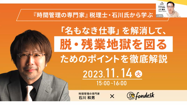 セミナーの企画は「fondesk」がターゲットとしている事務やバックオフィスの方が多く抱えている「残業がなくならない」という悩みに対して、石川様から専門家としての課題喚起やノウハウをご紹介いただきました。その後、具体的に電話対応に関する課題解決方法を「fondesk」から紹介したことで、セミナーの中でストーリーとして「fondesk」の価値を視聴者の方に理解いただけたと考えています。
