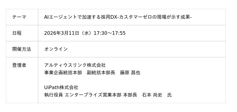 アルティウスリンクのセッションでは、「AIエージェントで加速する採用DX」をテーマに、年間1.5万人規模の採用を行う当社が取り組む採用改革について紹介します。AIエージェントとDXを活用した成果を、パートナーであるUiPath株式会社と共にお伝えします。「採用業務を効率化したいが、うまくいかない」「AIエージェント導入の進め方がわからない」など、採用DXの推進やAIエージェント活用に課題を抱える企業のご担当者に特におすすめの内容です。