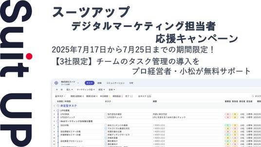 株式会社スーツ(所在地:東京都千代田区、代表取締役社長CEO:小松 裕介)は、チームのタスク管理・プロジェクト管理ツール「スーツアップ」において、デジタルマーケティング担当者応援キャンペーンを実施いたします。