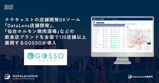 次世代金融インフラの提供を通して組込型金融を実現するFinatextグループの株式会社ナウキャスト(本社:東京都千代田区、代表取締役CEO:辻中仁士、以下「当社」)は、店舗開発DXツール「DataLens店舗開発」が、東京都内を中心に様々な業態の飲食店を運営するGOSSO株式会社 (本社:東京都渋谷区、代表者:藤田建、以下「GOSSO」)に導入され、同社の新規出店戦略に活用されることをお知らせします。