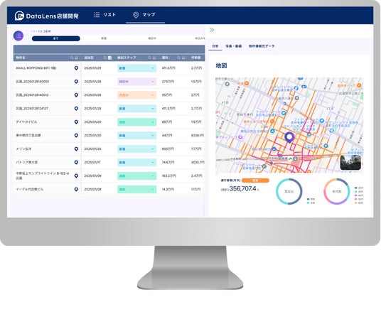 「DataLens店舗開発」は、クレジットカード決済データや人流データなどのオルタナティブデータと生成AIを用いて物件情報の収集・管理の効率化と物件選定の最適化を実現し、店舗開発者のデータドリブンな意思決定を助けるツールです。
