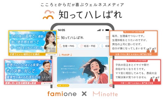 https://famione.com/benefit/ などを展開する株式会社ファミワン(本社:東京都渋谷区、代表取締役:石川勇介、以下当社)は、女性の心身のゆらぎを食でサポートする「Minotte(ミノッテ)」を運営するリボン食品株式会社(本社:大阪府大阪市、代表取締役:筏 由加子、以下リボン食品)との共同プロジェクトとして、『こころとからだが喜ぶウェルネスメディア「知ってハレばれ」』を10月9日(水)に公開したことをお知らせいたします。