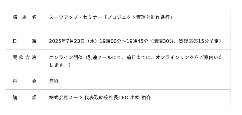 スーツアップ 無料お試しはコチラ1.スーツアップ・セミナー「プロジェクト管理と制作進行」概要当社では、2025年7月23日(水)19時から、当社代表の小松が講師を務めるスーツアップ・セミナー「プロジェクト管理と制作進行」を無料開催します。