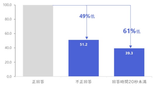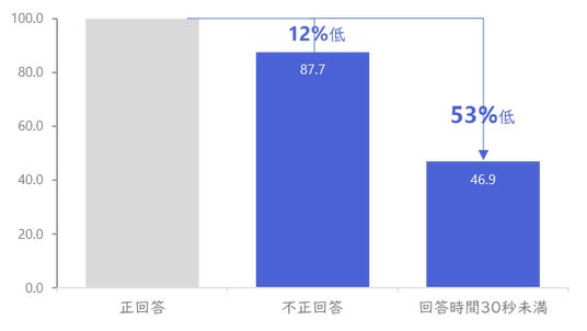 正回答者の滞在時間スコアを100とし、正回答者スコアと不正回答者スコアを比較。