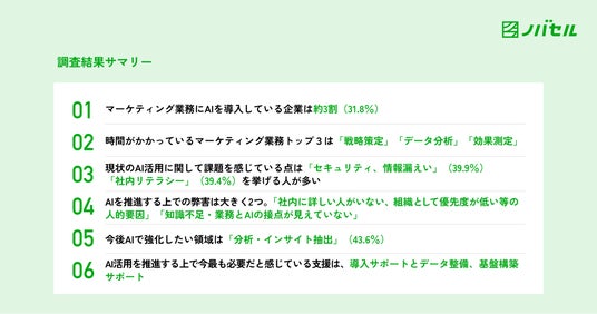 ソフトウェアとプロフェッショナル人材の力でマーケティングの民主化を目指すノバセル株式会社(本社:東京都港区、代表取締役社長:田部正樹、以下ノバセル)は、全国の事業会社でマーケティング業務に従事する会社員500名を対象に、「マーケティング業務における課題と、AI活用に関する実態調査」を実施しました。(調査期間:2025年6月20日~6月24日)