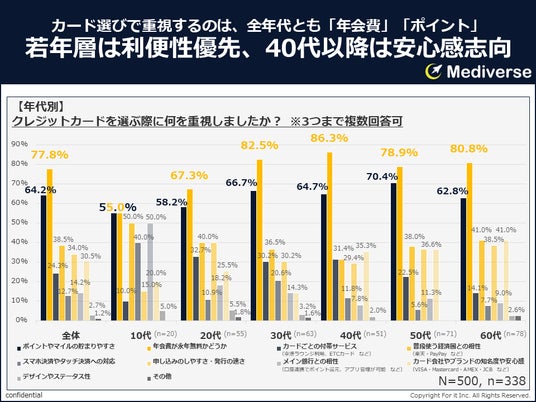年代別に見ると、カード選びの際に重視したことには、年代差が見られた。