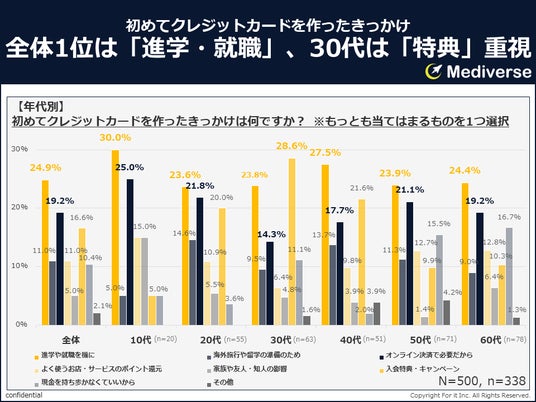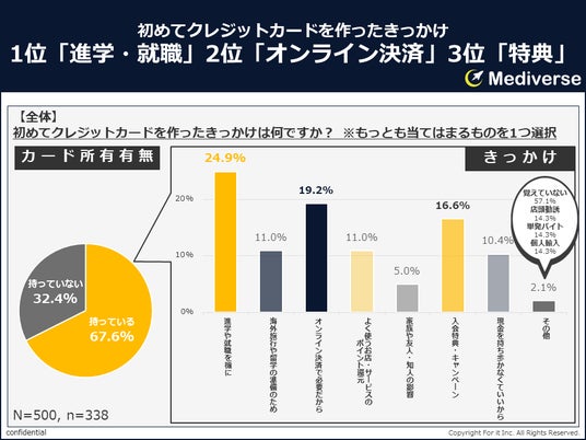 ・クレジットカードを作ったきっかけ全国18歳以上の男女500名のうち、クレジットカードを持っていると回答した67.6%(338名)に対して、初めてクレジットカードを作ったきっかけを聞いたところ、最も多かったのは、「進学や就職を機に」(24.9%)であり、約4人に1人が該当していることになる。2位に「オンライン決済に必要だから」(19.2%)、3位に「入会特典・キャンペーン」(16.6%)がランクインしていた。