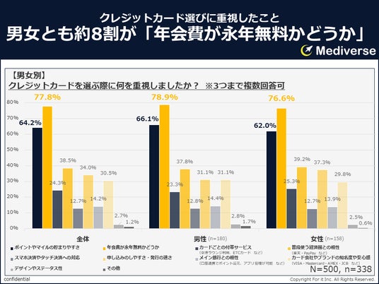 男女とも約8割が「年会費が永年無料かどうか」、6割強が「ポイントやマイルの貯まりやすさ」を重視していることがわかる。