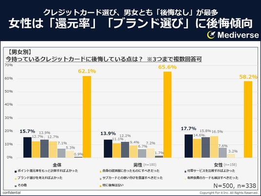 対して男性は、「有料会費のカードも検討すべきだった」(7.2%)が、女性(3.2%)の2倍以上となっており、カードのグレードや機能面への関心が相対的に高いことがうかがえる。