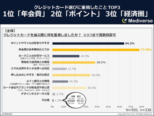 ・クレジットカード選びで重視したこと全国18歳以上の男女500名のうち、クレジットカードを持っていると回答した67.6%(338名)に対して、カード選びの際に重視したことを聞いたところ、約8割が「年会費が永年無料かどうか」に集中していた。