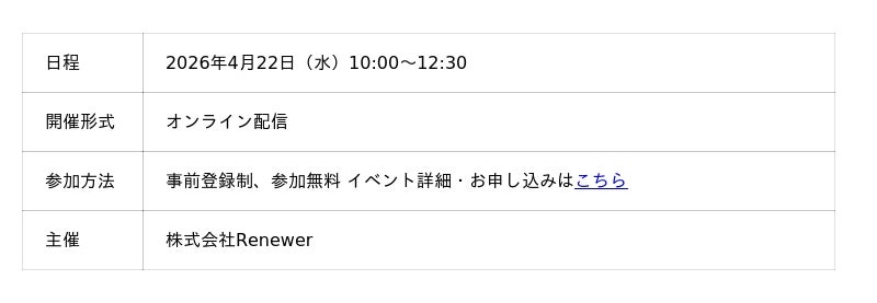 アルティウスリンクアルティウスリンク株式会社(所在地:東京都渋谷区、代表取締役社長:那谷 雅敏、以下 当社)は、2026年4月22日に株式会社Renewer主催のオンラインカンファレンス「MAKE AI NEXT 2026 Spring」に登壇します。本カンファレンスは、「エンタープライズ企業におけるAI活用の、次の”当たり前”を共に考える」という主旨のもと、生成AI・AIエージェント活用の最前線を共有するイベントです。