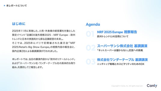 株式会社カンリーGoogle ビジネスプロフィール(TM)︎・HP・各SNSの一括管理サービス「カンリー店舗集客」の開発・提供を行う株式会社カンリー(所在地:東京都品川区、代表取締役:辰巳 衛,秋山 祐太朗)は、「講演レポート丨店舗DX海外視察2025 -NRF Europe-欧州トレンドと 日本の実践知から探る店舗経営の未来」を無料公開しましたので、ご案内いたします。レポートの無料請求はこちら「欧州の最新トレンド」と「日本企業のDX化による生存戦略」。