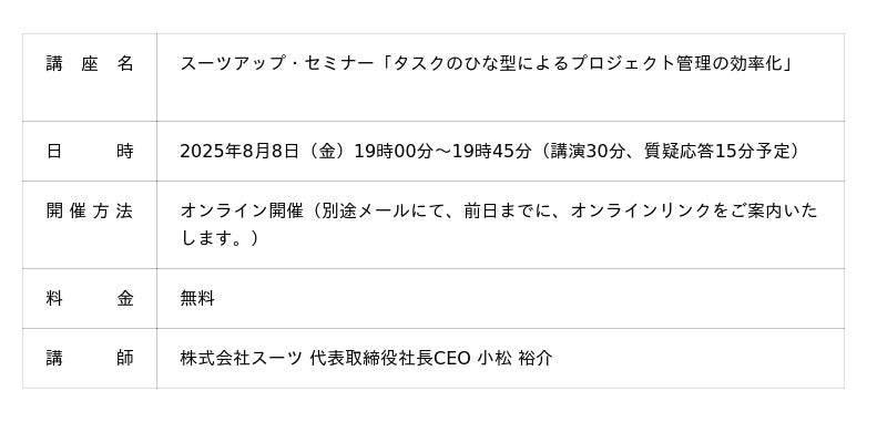 スーツアップ 無料お試しはコチラ1.スーツアップ・セミナー「タスクのひな型によるプロジェクト管理の効率化」概要当社では、2025年8月8日(金)19時から、当社代表の小松が講師を務めるスーツアップ・セミナー「タスクのひな型によるプロジェクト管理の効率化」を無料開催します。