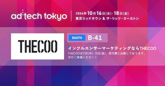 THECOO株式会社(本社:東京都渋谷区、代表取締役CEO:平良真人、証券コード:4255、以下当社)は、2024年10月16日(水)~18日(金) に東京ミッドタウン & ザ・リッツ・カールトン東京で開催される、「ad:tech tokyo 2024(アドテック東京2024)」に出展いたします。16日(水) はワークショップのみ開催、当社出展の展示会は17日(木)からの開催となります。