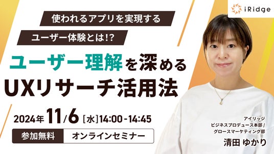 株式会社アイリッジ(本社:東京都港区、代表取締役社長:小田 健太郎、東京証券取引所グロース:3917、以下「アイリッジ」)は、2024年11月6日に経営者・マーケティング担当者向けオンラインセミナー「ユーザー理解を深めるUXリサーチ活用法」を開催することをお知らせします。