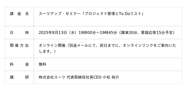 スーツアップ 無料お試しはコチラ1.スーツアップ・セミナー「プロジェクト管理とToDoリスト」概要当社では、2025年8月13日(水)19時から、当社代表の小松が講師を務めるスーツアップ・セミナー「プロジェクト管理とToDoリスト」を無料開催します。
