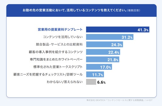 A. 営業コンテンツを作っても「運用体制が整っていない」(34.3%)という理由で活用されないケースが多いためです。社内のどこに資料があるのか分からない、使っても反応が見えない、誰が何を更新するのか決まっていない状態では、ツールがあっても現場で活かされません。営業プロセスの中に組み込み、誰が使い、どう判断するかまでを設計する仕組みが必要です。