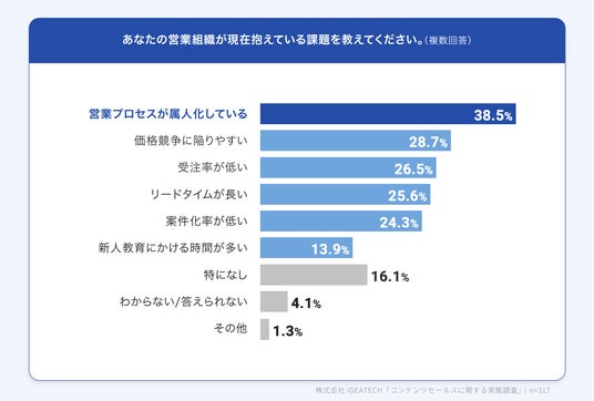 38.5%もの企業が「営業プロセスが属人化している」と回答し、共通の型がないまま、個人の経験や勘に頼って営業を進めている現状が浮き彫りになりました。