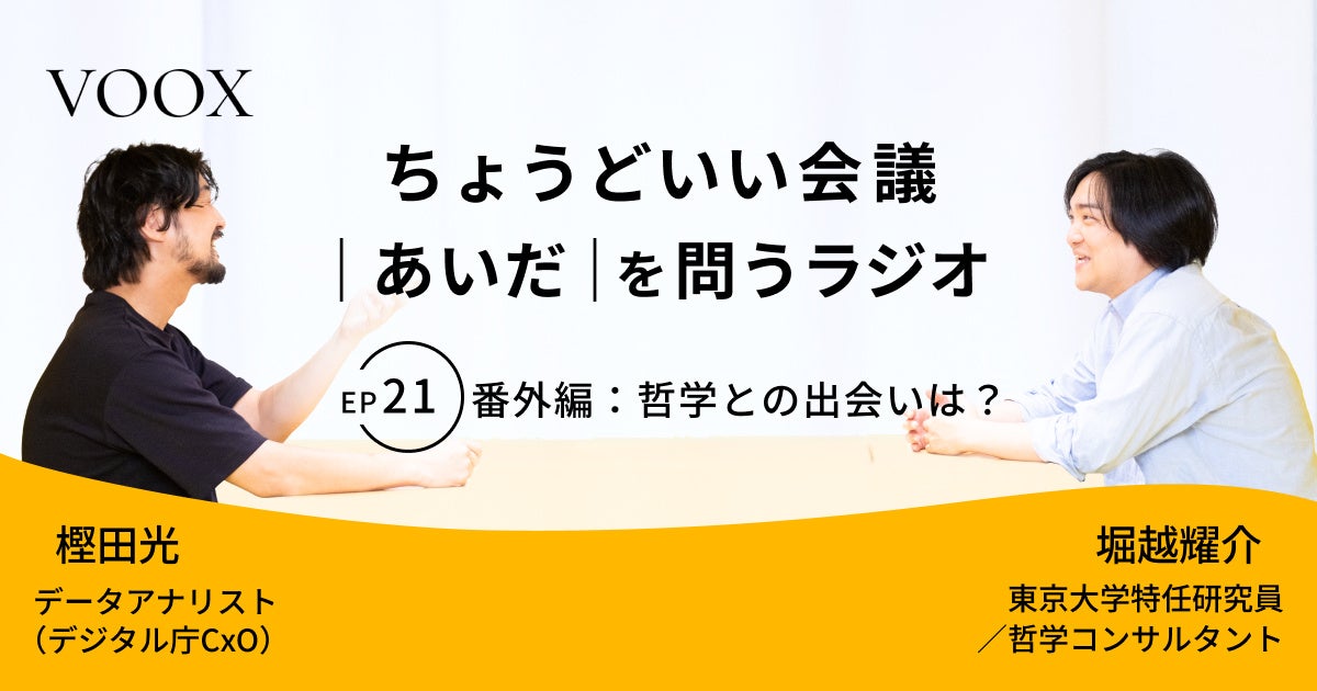 堀越耀介氏(東京大学特任研究員/哲学対話)と樫田光氏(デジタル庁/データ分析)。異なる専門性を持つ二人が世の中の様々な「白か黒か、どちらか一方に割り切れない物事」=“あいだ”について語り合います。何かと何かの“あいだ”を切り口に問いを進めることで予測不能な化学反応を生み出し、聴く人に新たな気づきを与えてくれる。そんな"ちょうどいい"を探求する二人のクロストークをお楽しみください。