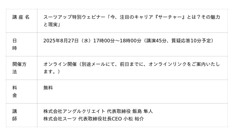株式会社スーツ(所在地:東京都千代田区、代表取締役社長CEO:小松 裕介)は、2025年8月27日(水)17時から、ゲスト講師に、株式会社アングルクリエイト 代表取締役 飯島 隼人氏を迎え、第15回となるスーツアップ特別ウェビナー「今、注目のキャリア『サーチャー』とは?その魅力と現実」を無料開催します。