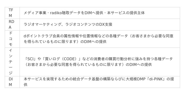TFM、RDA、ドコモ、インテージ、 DIMは、データマーケティングの時代に対応し、ラジオ広告を活用した新たなマーケティングおよびプロモーションサービスの創出に向け、今後も積極的に取り組んでまいります。さらに、エフエム東京をキー局とするジャパンエフエムネットワーク38局全体のリスナー可視化を図り、株式会社エフエム北海道※8を皮切りにラジオ広告のDXを進めてまいります。