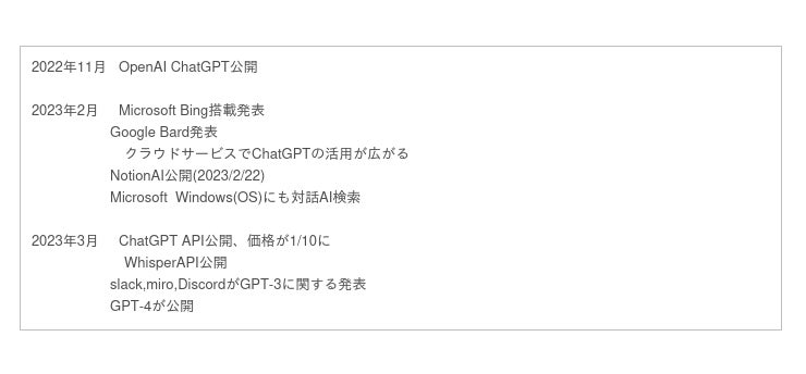 ChatGPTの発表から今までにどんな動きがあったのか伝えていきました。2022年11月の登場から現在に至るまで、下記のような変化がありました。