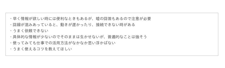 様々な技術に取り入れられているChatGPTですが、具体的に使ってみたらどのように生かせるのでしょうか?使用してみての感想は下記の通りです。