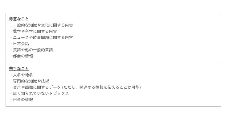 ただし、ChatGPTもすべての情報に正しく回答できるわけではありません。得意なこと、苦手なことを下記にまとめました。下記を参考にChatGPTを活用してみてはいかがでしょうか?