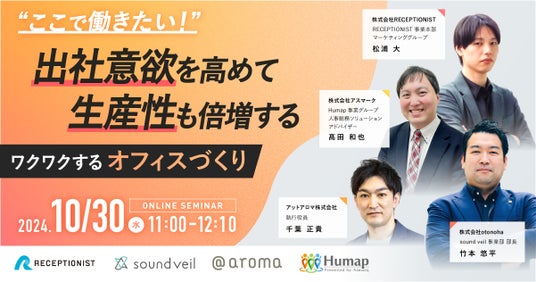 従業員総活躍サービス「Humap」を提供する株式会社アスマーク(東京都渋谷区東、代表取締役:町田正一)は、2024年10月30日(水)11:00から「出社意欲を高めて生産性も倍増するワクワクするオフィス作り」をテーマに、株式会社RECEPTIONIST・アットアロマ株式会社・株式会社otonohaと4社共催セミナーを開催いたします。