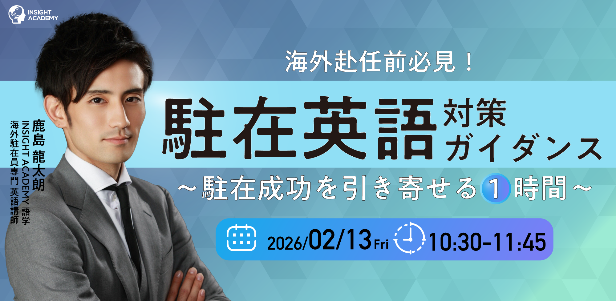 鹿島 龍太朗氏INSIGHT ACADEMY 語学 海外駐在員専門 英語講師≪経営層も学んでいる、海外赴任者専門の英語指導者≫海外・ビジネス経験を活かし、12年以上にわたり経営層・会計職・研究者・営業・エンジニアなど、多様な職種の駐在者をサポート。